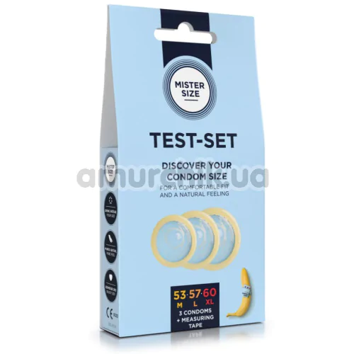 Mister Size Test Set 53 57 60 - набор латексных изделий для секса, который позволит Вам правильно подобрать защиту по размеру Вашего члена. В набор входит линейка для измерения.